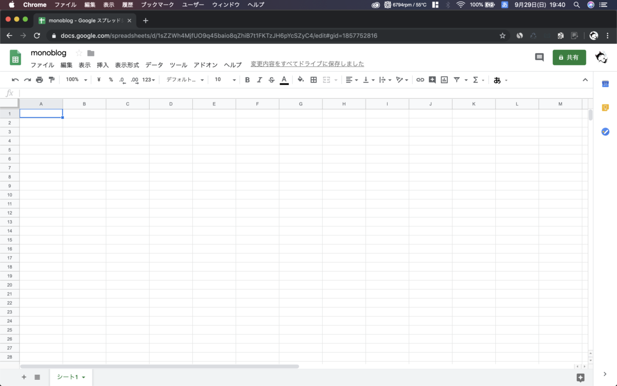 まず、ショートカットを作成したいスプレッドシートをブラウザ上で起動します。